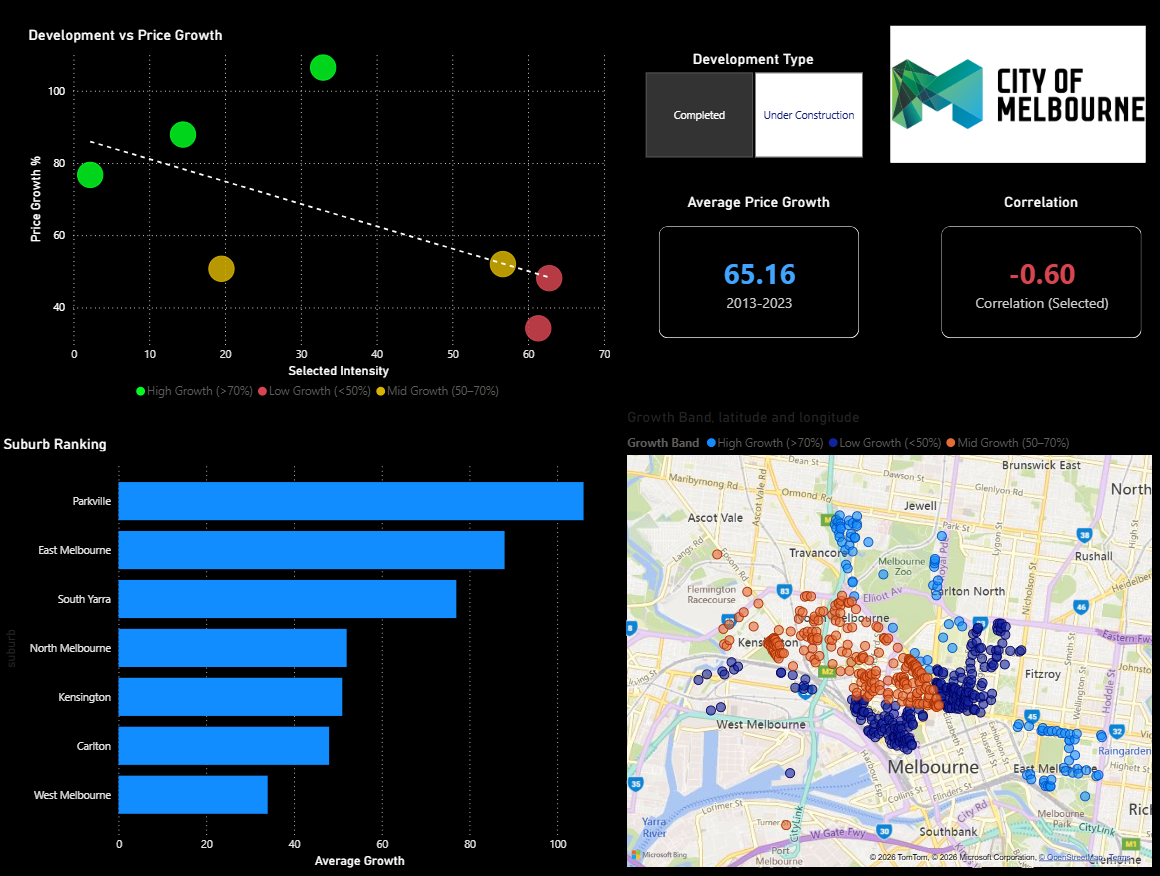 I integrated 10-year median house price data (2013–2023) with development project records and calculated development intensity per suburb. Using Power BI and DAX, I analysed the relationship between development activity and price growth, separating completed projects from those still under construction to understand whether supply at different stages has different market impacts. The findings show a moderate negative correlation: -0.60 for completed projects and -0.52 for under-construction projects.